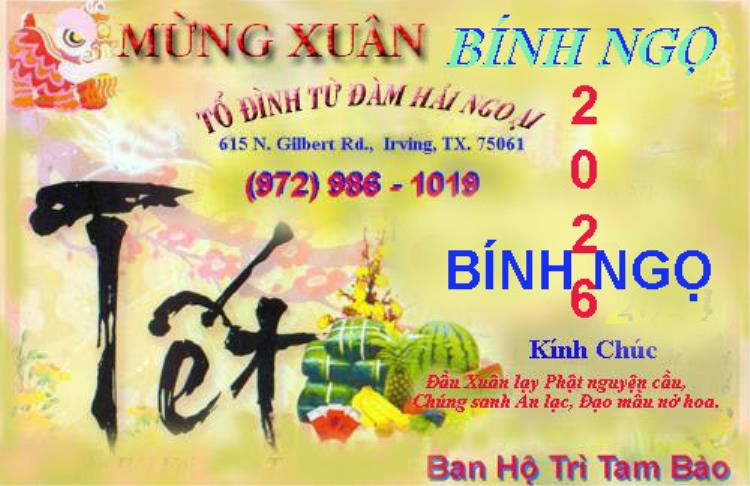 Thừa lệnh Hòa thượng Viện chủ và thay mặt Tổ Đình Từ Đàm Hải Ngoại, trước thềm năm mới Xuân Bính Ngọ - 2026, Chúng con/Chúng tôi trang trọng thành tâm kính đảnh lễ Chư Tôn Đức Lãnh Đạo Bốn Giáo Hội và kính niệm ân toàn thể Đồng bào Phật tử khắp đó đây đã nhất tâm cầu nguyện cho Hòa thượng Tăng Trưởng kiêm Tọa chủ Tổ Đình Từ Đàm Hải Ngoại đã không may bị ngả từ lầu cao xuống đất và bị gãy xương cổ, hiện đang điều trị và tịnh dưỡng tại bổn tự ; Chúng con/Chúng tôi nhất tâm đảnh lễ và niệm ân chư Chư Tôn đức Tăng Ni, quý Đồng bào Phật tử, quý Tôn giáo bạn, quý Hội đoàn, quý Cơ quan Truyền thông Báo chí và quý Thân chủ Thương mãi nguyện cầu luôn được an khang trường thọ và sở cầu như ý trong năm mới.