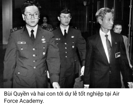 Tới nơi, anh chàng được đưa thẳng về một căn cứ Không Quân ở Colorado và đưa ngay vào Phòng Khánh Tiết. Trong phòng, Tướng Tá Mỹ đứng lố nhố, người ta bảo với Quyền : “Lát nữa,Tổng Thống Bush sẽ tới và sẽ gắn lại hết các huy chương mà Quân Đội Mỹ đã trao tặng anh, sau đó anh sẽ tháp tùng Tổng Thống lên khán đài !”. Hóa ra đây là ngày lễ mãn khóa của con trai Quyền. Quyền có hai người con trai, đều là sinh viên phi công tại United States Air Force Academy. Một cậu đậu Á Khoa. Trước ngày mãn khóa, Tướng Chỉ Huy Trưởng của Trường gọi cậu lên và bảo : “Anh là người tị nạn, mới qua đây mà đã thành công rực rỡ. Anh có đặc ân gì muốn nhờ tôi, nếu làm được, tôi sẽ cố gắng giúp anh toại nguyện. Người con trai Quyền trả lời : “Tôi chỉ có một ước vọng. Đó là nhìn thấy bố tôi ngồi trên khán đài dự lễ gắn lon của tôi”. Ông Tướng đã sử dụng hết quyền lực của mình để vận động cho Quyền sang Mỹ dự lễ mãn khóa của người con trai. Đây là một chuyện hi hữu mà tôi mới được nghe, trình với bà con xa gần để chia sẻ ngọt bùi !”.