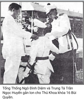 Có điều Quyền vào quân trường đúng lúc. Khóa 16 là khóa đầu tiên của trường Võ Bị Liên Quân Đà Lạt đổi mới. Tổng Thống Ngô Đình Diệm đã ký một sắc lệnh vào ngày 29/7/1959 đổi tên trường thành “Trường Võ Bị Quốc Gia Việt Nam”. Chương trình học kéo dài trong ba năm, vừa học văn hóa, vừa tập quân sự. Đây là một thứ West Point Việt Nam. Khi tốt nghiệp, ngoài phần quân sự, các sĩ quan của trường có trình độ Đại học năm thứ hai. Khóa 16 đổi mới này bắt đầu vào ngày 23/11/1959 với các sinh viên được tuyển chọn kỹ lưỡng qua một cuộc thi tuyển. Chuyện chi cũng vậy, khởi đầu thường là thứ khuôn mẫu. Ngày nhập học có 326 khóa sinh nhưng ngày ra trường 22/12/1962 chỉ còn 226 sĩ quan tốt nghiệp. Tổng Thống Ngô Đình Diệm đã đích thân tới chủ tọa lễ ra trường và gắn lon cho thủ khoa Bùi Quyền. Nhìn hình bạn mình quỳ nhận lon giữa một bên là Tổng Thống, một bên là Trung Tá Trần Ngọc Huyến, Chỉ Huy Trưởng của trường, tôi thấy hãnh diện với bạn. Bức hình Quyền cao lớn trong bộ đại lễ, giương cung bắn ra bốn phương trời làm tôi nghĩ Quyền đã thỏa chí làm trai.