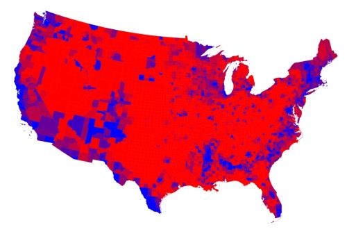 Màu đỏ là vùng Cộng Hòa thắng trong cuộc bầu cử Tổng Thống ; màu xanh là vùng Dân chủ.