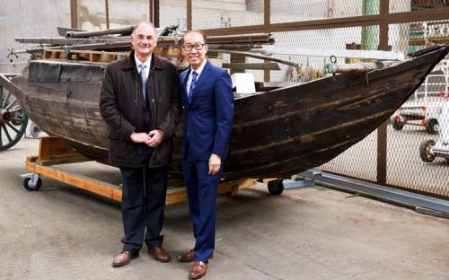 Ông Didier Raux (trái), giám đốc Viện Bảo Tàng Hàng Hải Le Harve của Pháp, và ông Châu Thụy, chủ tịch sáng lập VHM, đứng trước Chiếc Ghe Viễn Xứ. (Hình : VHM)